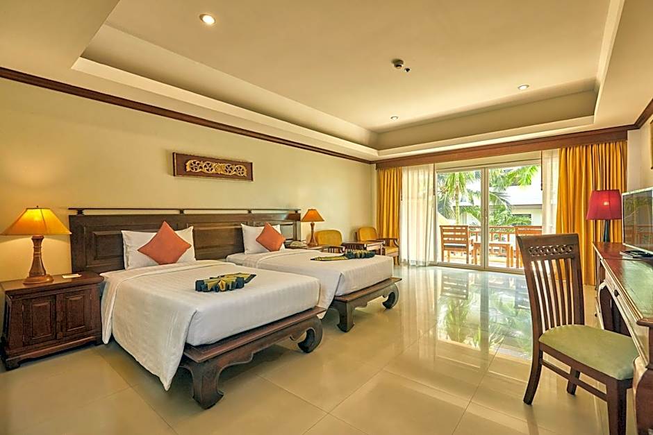The twin room features a tea and coffee maker and pool views. The unit has 2 beds.